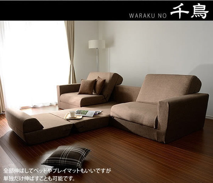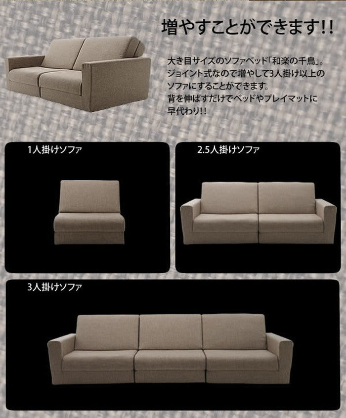 | 商品仕様 | 商品仕様:和楽の千鳥 サイズ(2.5P):幅1900×奥行950?2400×高さ480?710mm 構造部材:スチールパイプ クッション材:ウレタン 生地:ポリエステル100% 重量:58Kg 生産:日本製 |
