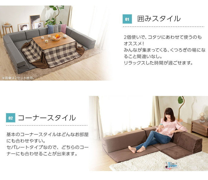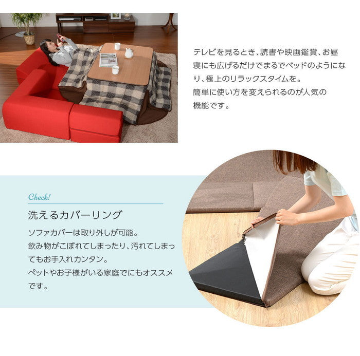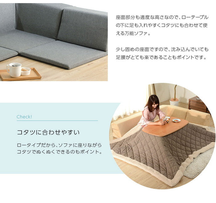 | 商品説明 | 憩いのロースタイルでいつも楽しく温かい空間に。 洗えるカバーリングで清潔に使える。 組み合わせ自由で、レイアウトも楽しめる。 一人掛け用、二人掛け用部分は背もたれを倒せるのでゆったりリラックスモードに。なだらかな曲線が体にフィットする開発者こだわりのデザイン。 テレビを見るとき、読書をするとき、昼寝にも。極上タイムをご提案いたします。 もちろんこたつとあわせてこたつソファにも大活躍です。 |