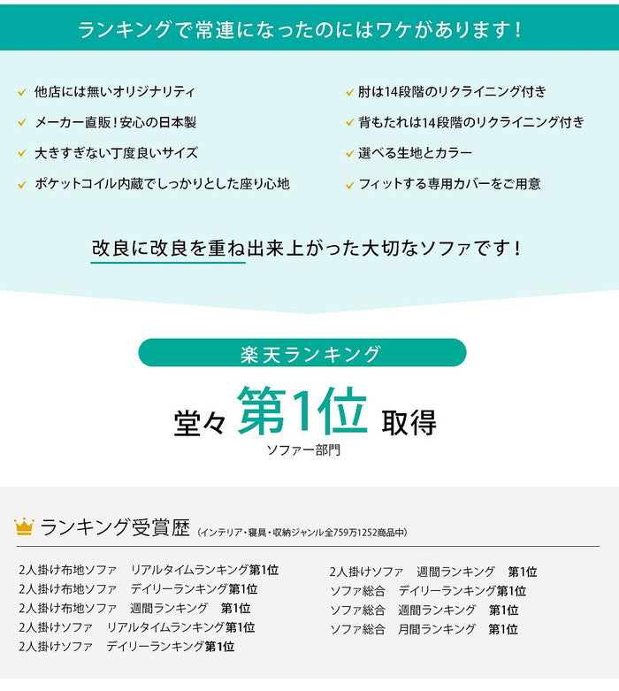 | 商品説明 | コンパクトで圧迫感がなく、お部屋を広く見せることが出来る、当店自慢のこだわりのソファ。 1人暮らしの方にもオススメです。 豊富なカラーバリエーション、お部屋に合わせてお選びいただけます。 |