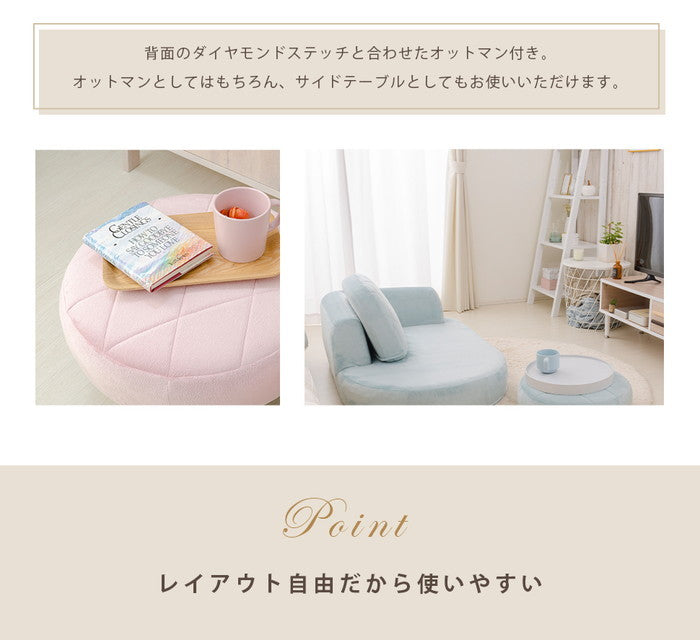 | 商品説明 | お部屋が狭くなりがちな一人暮らしの方にもぴったりなコンパクトサイズ。ダイヤモンドステッチを取り入れ、エレガントに仕上げました。 オットマンはサイドテーブルとしてもお使いいただけます。 |