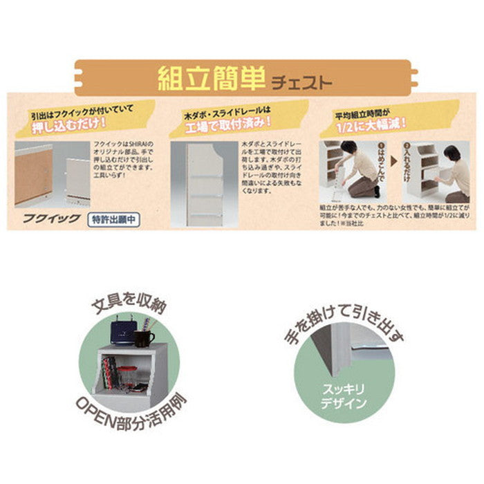 | 商品説明 | 使いたい場所にぴったり選べる組立簡単チェスト 【CHESCA】(チェスカ) 木質感とオープン部分のデザインがおしゃれ! サイズを選べる組立簡単チェストです。 上部オープン部分は背板に配線穴が付いているので、 テレビなど、デジタル機器を乗せて使うこともできます。(最適サイズ:24V型) 引出はシライオリジナルの「フクイック」を使用することで、 手で押し込むだけで引出の組立ができるので工具いらず! 木ダボ・スライドレールは工場で取付済みです。 木ダボの打ち込みすぎや、スライドレールの取付向き間違いによる失敗もなくなります。 組立てが苦手な人でも、力のない女性でも、簡単に組立てが可能に! 今までのチェストと比べて、組立時間が1/2に減りました! ※当社比 清潔で明るいホワイトカラー。 小物が多いキッチンで、ちょっとしたスペースを利用して。 ※湿気の多い空間には設置しないでください。 また、商品に水や蒸気がかからないようにご注意ください。 天板耐荷重:10kg 中棚耐荷重:5kg 特殊加工 天板:ソフトフォーム 引出前板:ラッピング ・組み立て式 この商品はF☆☆相当です。 |