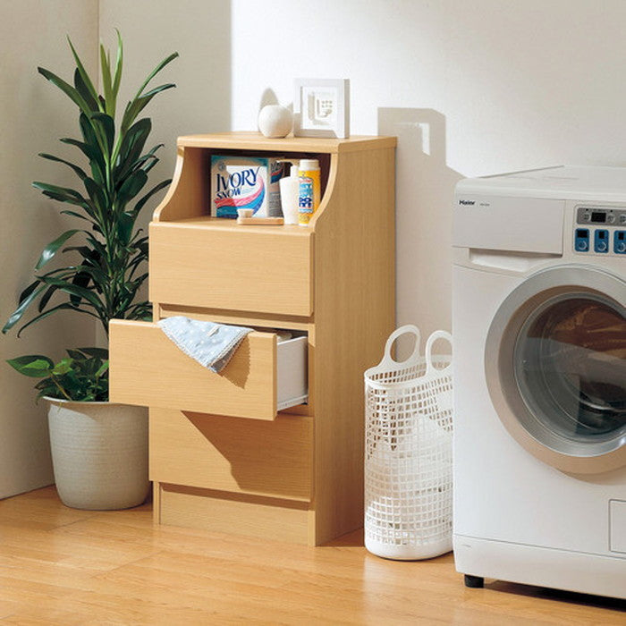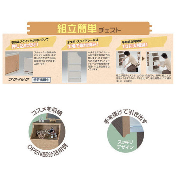 | 商品説明 | 使いたい場所にぴったり選べる組立簡単チェスト 【CHESCA】(チェスカ) 木質感とオープン部分のデザインがおしゃれ! サイズを選べる組立簡単チェストです。 上部オープン部分は背板に配線穴が付いているので、 テレビなど、デジタル機器を乗せて使うこともできます。 引出はシライオリジナルの「フクイック」を使用することで、 手で押し込むだけで引出の組立ができるので工具いらず! 木ダボ・スライドレールは工場で取付済みです。 木ダボの打ち込みすぎや、スライドレールの取付向き間違いによる失敗もなくなります。 組立てが苦手な人でも、力のない女性でも、簡単に組立てが可能に! 今までのチェストと比べて、組立時間が1/2に減りました! ※当社比 優しい色合いのナチュラルカラー。 タオルなど、ちょっと置いておきたい狭いスペースに使えます。 ※湿気の多い空間には設置しないでください。 また、商品に水や蒸気がかからないようにご注意ください。 天板耐荷重:10kg 中棚耐荷重:5kg 特殊加工 天板:ソフトフォーム 引出前板:ラッピング ・組み立て式 この商品はF☆☆相当です。 |