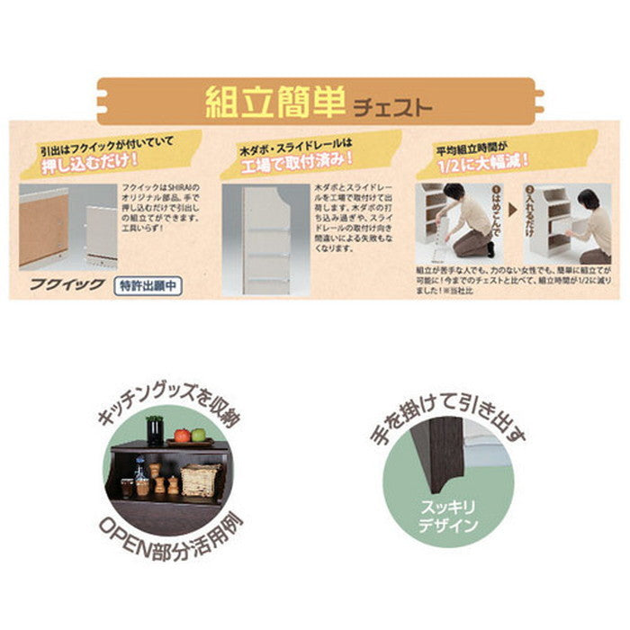| 商品説明 | 使いたい場所にぴったり選べる組立簡単チェスト 【CHESCA】(チェスカ) 木質感とオープン部分のデザインがおしゃれ! サイズを選べる組立簡単チェストです。 上部オープン部分は背板に配線穴が付いているので、 テレビなど、デジタル機器を乗せて使うこともできます。 引出はシライオリジナルの「フクイック」を使用することで、 手で押し込むだけで引出の組立ができるので工具いらず! 木ダボ・スライドレールは工場で取付済みです。 木ダボの打ち込みすぎや、スライドレールの取付向き間違いによる失敗もなくなります。 組立てが苦手な人でも、力のない女性でも、簡単に組立てが可能に! 今までのチェストと比べて、組立時間が1/2に減りました! ※当社比 優しい色合いのナチュラルカラー。 タオルなど、ちょっと置いておきたい狭いスペースに使えます。 ※湿気の多い空間には設置しないでください。 また、商品に水や蒸気がかからないようにご注意ください。 天板耐荷重:5kg 中棚耐荷重:5kg 特殊加工 天板:ソフトフォーム 引出前板:ラッピング ・組み立て式 この商品はF☆☆相当です。 |