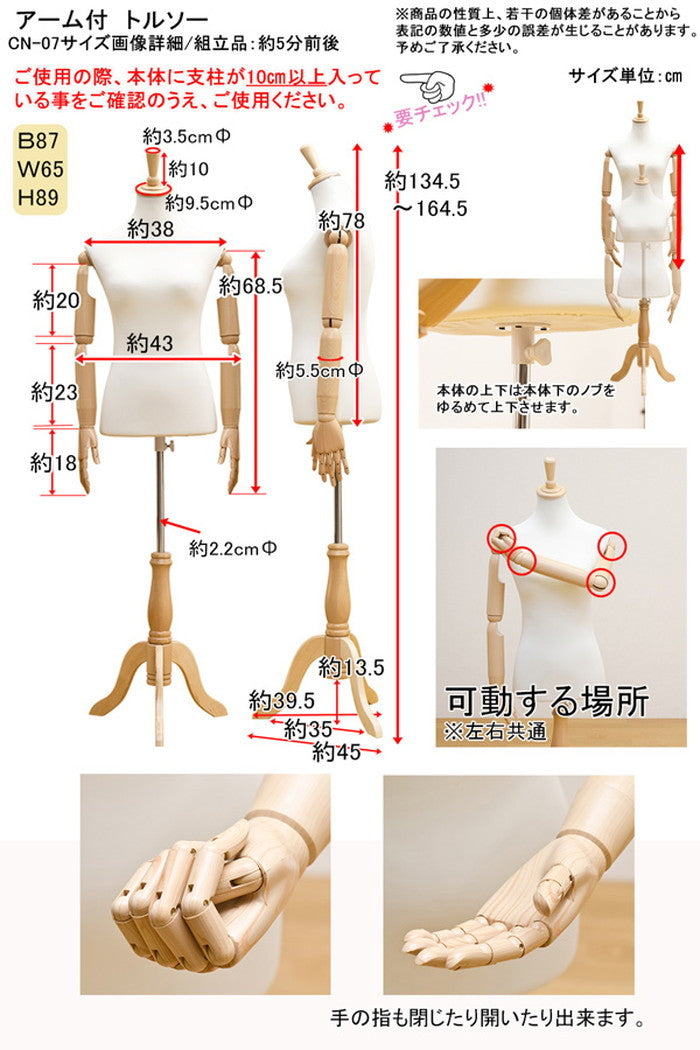 | 商品説明 | アーム付きトルソーです バスト約87cm、ウエスト約65cm、ヒップ約89cm、肩幅約38cm 針は刺せません パンツ対応ではありません アームは関節を曲げることが出来ます 指も曲がります アームがあることでイメージが膨らみます ■移動の際は、本体と支柱を持って移動して下さい 【腕の脱着について】 外すことはできますが、付けたり外したりを頻繁に繰り返すと、外れやすくなってしまうことがありますので、ご注意ください。 肩の部分に突起物があり、肩を差し込むとその突起した部分が引っかかり、取れにくくなっている仕様なので、着脱を繰り返すと、突起がすり減って引っかからなくなってしまいます。 |
