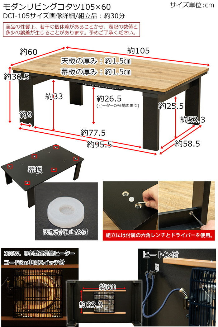 | 商品詳細 | 幅1050×奥行600×高さ365mm(梱包サイズ:幅1070×奥行630×高さ115mm) 天板厚:約15mm 中天板厚:約15mm 本体重量:18.3kg(梱包重量:20.0kg) 組立式(約30分/付属の工具にて組立)1個口 天板:(OAK・VBR・MWH)強化紙化粧繊維板、(WAL)合成樹脂化粧繊維板(PVCシート貼り) 中天板:プリント紙化粧繊維板 幕板:プリント紙化粧繊維板 脚:合成樹脂化粧繊維板(PVCシート貼り) ヒーター:300W U字型石英管ヒーター、コード3m 中間スイッチ付き) 原産国:インドネシア |