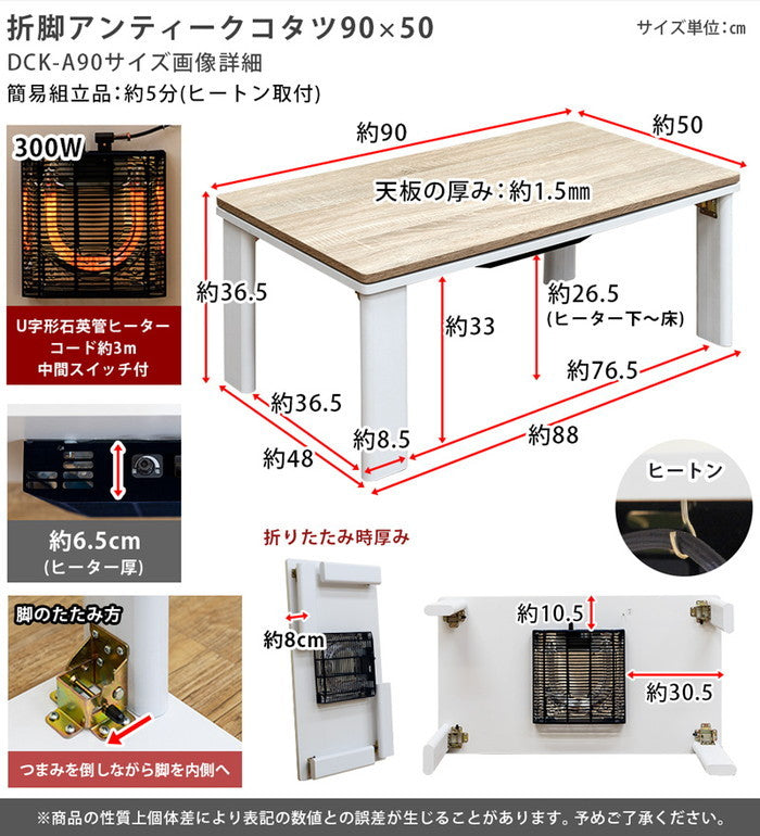 | 商品詳細 | 幅900×奥行500×高さ365mm(梱包サイズ:幅935×奥行530×高さ125mm 天板厚:約15mm 本体重量13.7kg(梱包重量:15.7kg) 簡易組立(約5分/ヒートン取り付けのみ)1個口 天板:15mm厚パーティクルボード(PVC貼り) 幕板・脚:中密度繊維板(PVC貼り) ヒーター:300W U字型石英管ヒーター、コード長さ:約3m(中間スイッチ付き) 原産国:インドネシア |