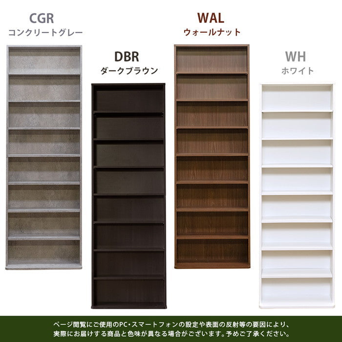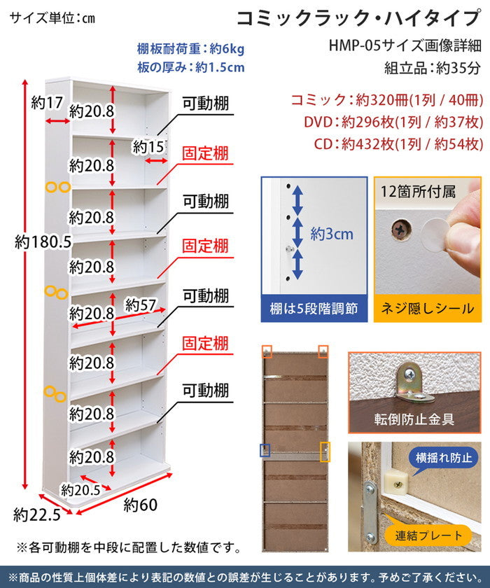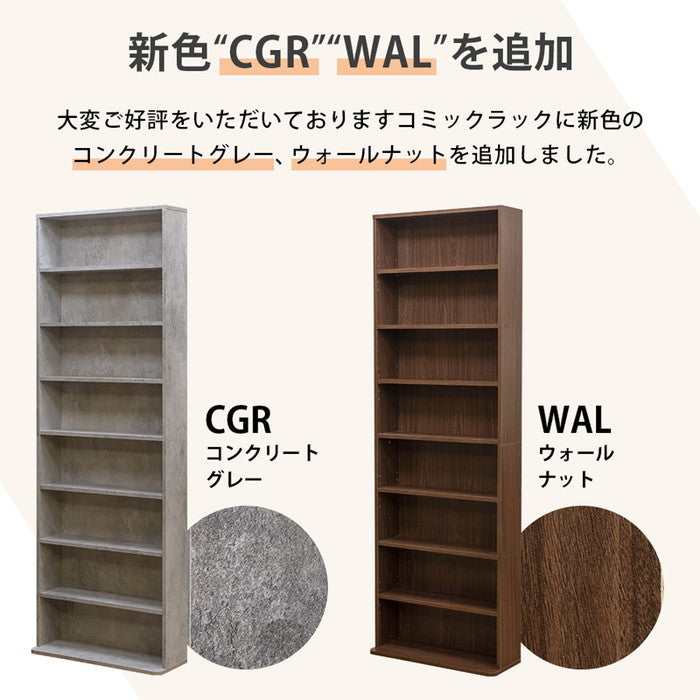 | 商品説明 | 収納量たっぷりのコミックラック ハイタイプです 奥行きわずか17cmとスリムなフォルム(床設置面は22.5cmあります) 圧迫感がなく置き場所を選ばず使えるコミックラックです 可動棚は5段階に調節可能 4枚が可動棚になります(サイズ画像参照) 【最大収納枚数】 ■コミック・単行本 約320冊(1列/40冊) ■DVD 約296枚(1列/37枚) ■CD 約432枚(1列/54枚) ※棚板耐荷重:約6kg ※材質・構造上、棚板は荷重により反りや撓みが生じる可能性がございます。交換対象外です。※ 本やCD、DVDの収納に役立ちます 本やCD以外でコレクションラックとしてもお使いいただけます 裏面8ヶ所に揺れ止めが付きますので安定感があります 組立後にネジ穴を隠すシールが付属します ハイタイプには転倒防止のL字金具が付属しますので壁面と本体を固定出来ます ダークブラウン(DBR)、ホワイト(WH)、コンクリートグレー(CGR)、ウォールナット(WAL)の4色展開です |