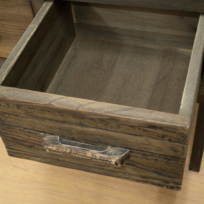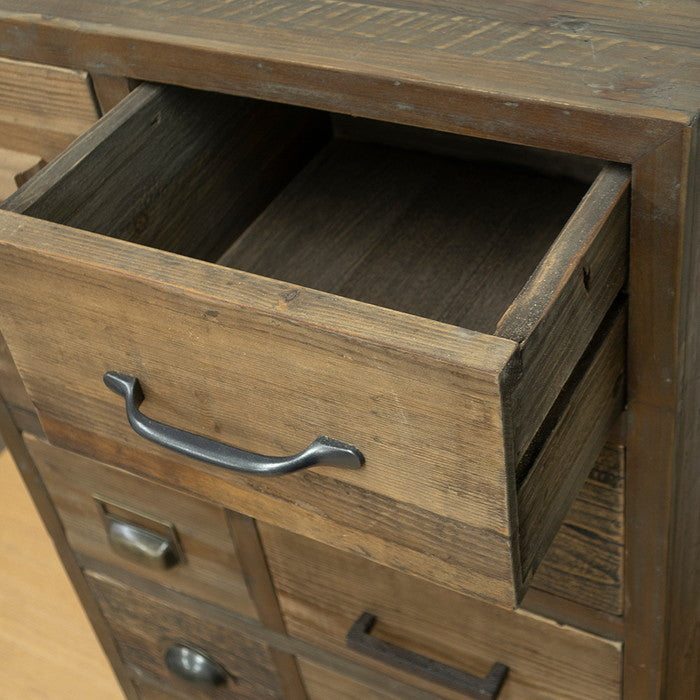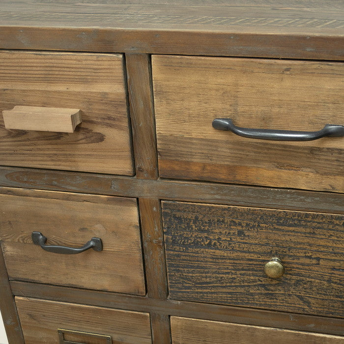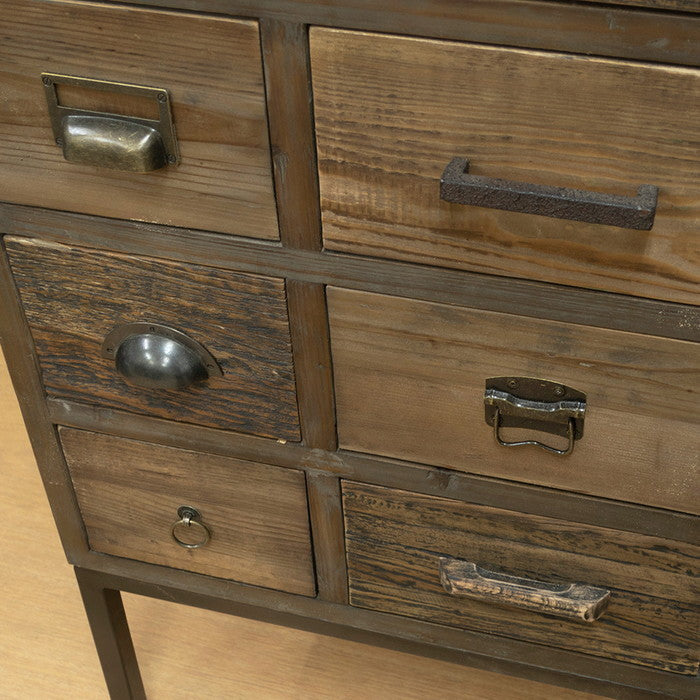 | 素材 | ■生産地:中国 ■素材・成分:本体:モミ古材 引き出し:モミ古材 、パイン古材、エルム古材 脚部:スチール 黒皮風塗装仕上げ |
