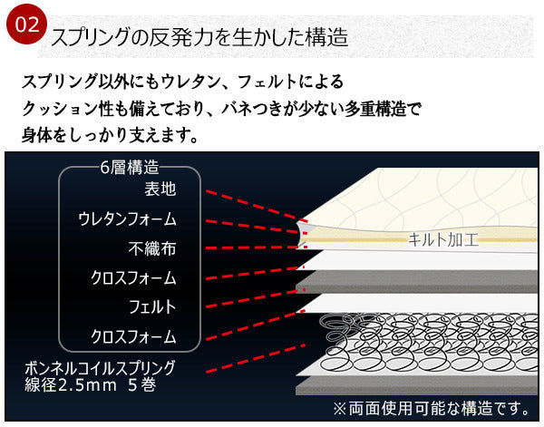 | 商品説明 | デザインパネルベッド セミシングル 日本製ボンネルコイルマットレス付き ■商品説明 ■フレーム寸法/幅98.5×奥行199.5×高さ66cmMH約37cm ■マットレス寸法/幅90×奥行195×高さ18cm ■本体主材/プリント化粧板 ■マットレス主材/2.5mmボンネルコイルスプリング(コイル数192個)、ウレタンフォーム、フェルト、ポリエステル綿混合張地、両面多針キルティング加工 ■生産国 本体/日本マットレス/日本 ※こちらの商品はお客様組立商品となります。 ※大型商品の為日時指定不可となります。 |