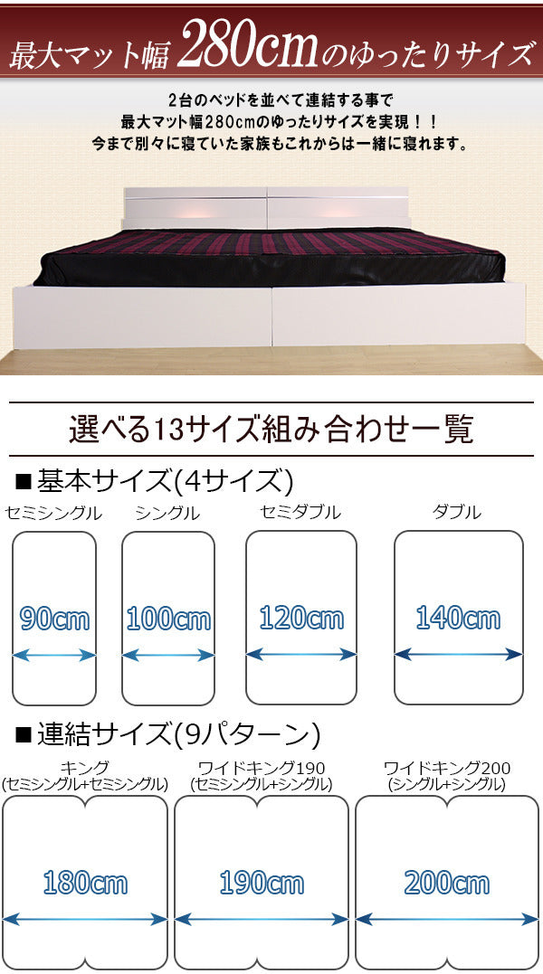 | 商品説明 | 棚と照明付きデザインベッド マットレス付き ■商品説明 ■フレーム寸法/幅253×奥行208×高さ66cmMH約36cm ■マットレス寸法/幅120+120×奥行195×高さ17cm ■本体主材/プリント化粧板、白熱灯(10W)1灯 ■マットレス主材/2.1mmボンネルコイルスプリング(コイル数330+330個)、2.2mmポケットコイルスプリング(コイル数98+98個)、ウレタン、フェルト、ポリエステル、両面多針キルティング加工 ■生産国 本体/日本マットレス/中国 ※こちらの商品はお客様組立商品となります。 ※大型商品の為日時指定不可となります。 |