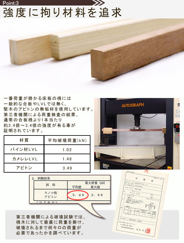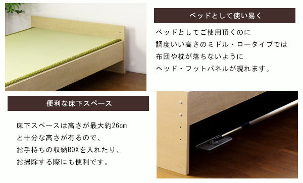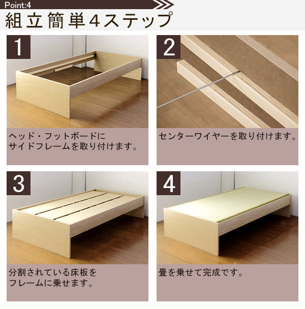 | 商品説明 | ヘッドレス高さ調節 畳ベンチベッド シングル ウレタン入りクッション畳付 ■商品説明 ■フレーム寸法/幅101×奥行198.5×高さ45cm ■本体主材/プリント化粧板 ■畳主材/い草、チップウレタン、防湿防虫加工 ■生産国 本体/日本 ※こちらの商品はお客様組立商品となります。 ※大型商品の為日時指定不可となります。 |