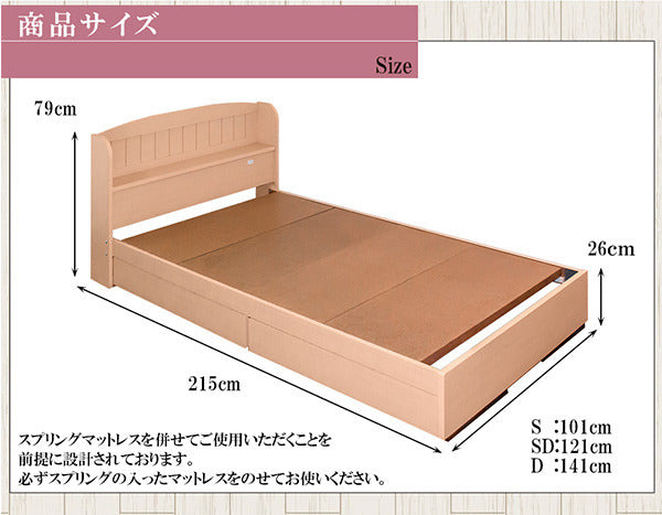 | 商品説明 | カントリー調引き出し付ベッド シングル ポケットコイルスプリングマットレス付 ■商品説明 ■フレーム寸法/幅100×奥行215×高さ79cmMH約43cm ■引出し内寸/大:W約96×D約40×H約10cm、小:W約90×D約35×H約10cm ■マットレス寸法/幅100×奥行195×高さ18cm ■本体主材/プリント化粧板、1口コンセント(1200W) ■マットレス主材/2.0mmポケットコイルスプリング(コイル数496個)、ウレタンフォーム、ポリエステル綿混合張地、両面多針キルティング加工 ■生産国 本体/日本マットレス/中国 ※こちらの商品はお客様組立商品となります。 ※大型商品の為日時指定不可となります。 |