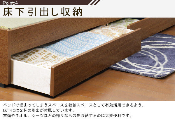 | 商品説明 | モダン畳ベッド セミダブル くっしょんマット畳付 ■商品説明 ■フレーム寸法/幅121×奥行211×高さ72cm ■引出し内寸/大:W約96×D約40×H約10cm、小:W約90×D約35×H約10cm ■本体主材/プリント化粧板、白熱灯(10W)1灯、1口コンセント(1200W) ■畳主材/い草、チップウレタン、防湿防虫加工 ■生産国 本体/日本 ※こちらの商品はお客様組立商品となります。 ※大型商品の為日時指定不可となります。 |